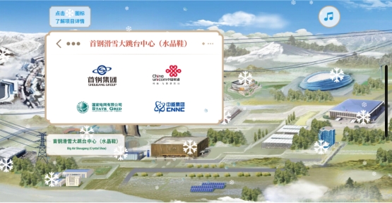 向左滑动来到首钢园附近,由首钢集团建设的首钢滑雪大跳台(水晶鞋)与首钢冷却塔交相辉映,这里将承担单板和自由式滑雪大跳台比赛项目,其设计理念源自中国敦煌壁画中传统的飞天造型,从侧面看去犹如一只灵动的“水晶鞋”。首钢园作为冬奥组委所在地,由中核集团、国家电网、中国联通等提供的技术服务,是奥运筹备和指挥神经中枢的重要保障。