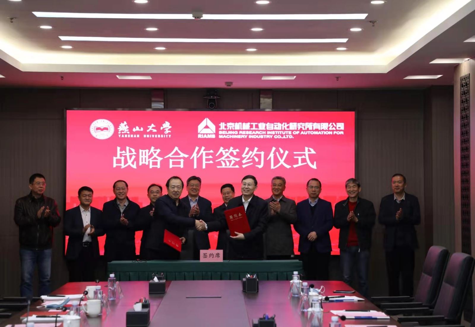 北自所黄雪副总经理、燕大赵永生副校长共同签署了战略合作协议,北自所王振林董事长、燕大赵险峰书记等双方代表共同见证。