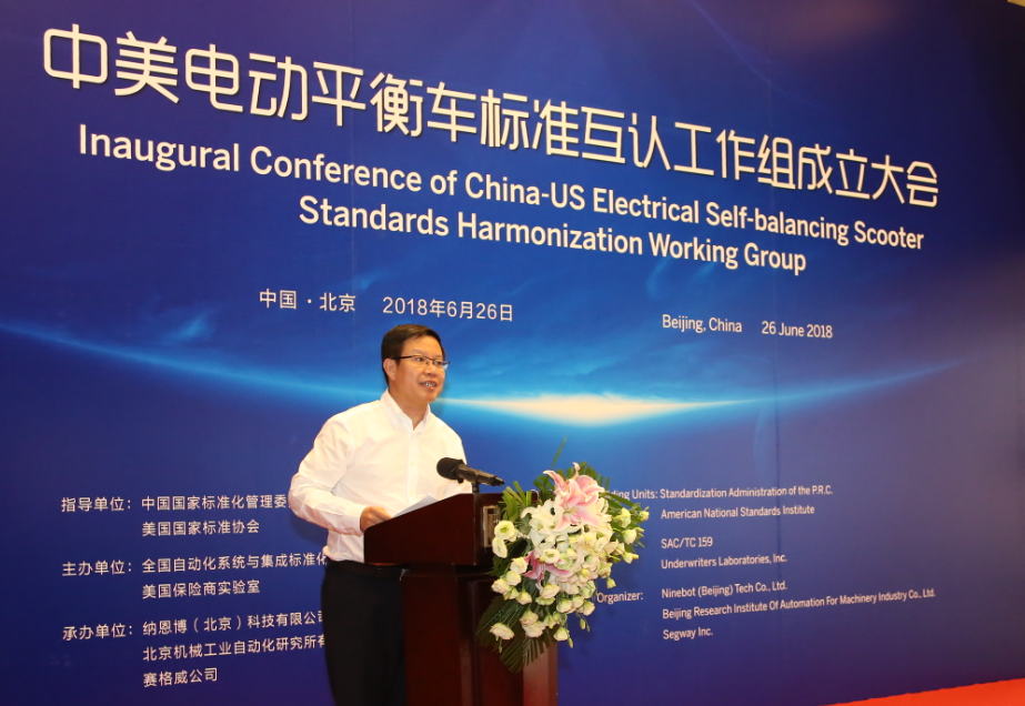 6月26日,中美电动平衡车标准互认工作组成立大会在北京唯实大厦成功举行。全国自动化系统与集成标准化技术委员会主任委员、机械总院集团董事长王德成与美国保险商实验室全球副总裁 Philip M.Piqueira分别代表中美双方签署电动平衡车标准互认合作协议。中国国家标准化管理委员会副主任殷明汉、IEC美国国家委员会副主席Sonya Bird、美国大使馆参赞Cynthia Griffin、北京航空航天大学教授王田苗、全国自动化系统与集成标准化技术委员会秘书长黎晓东、Segway-Ninebot公司总裁王野等领导及电动平衡车国家标准起草组专家出席会议,共同见证了中美两国标准化合作的历史时刻。